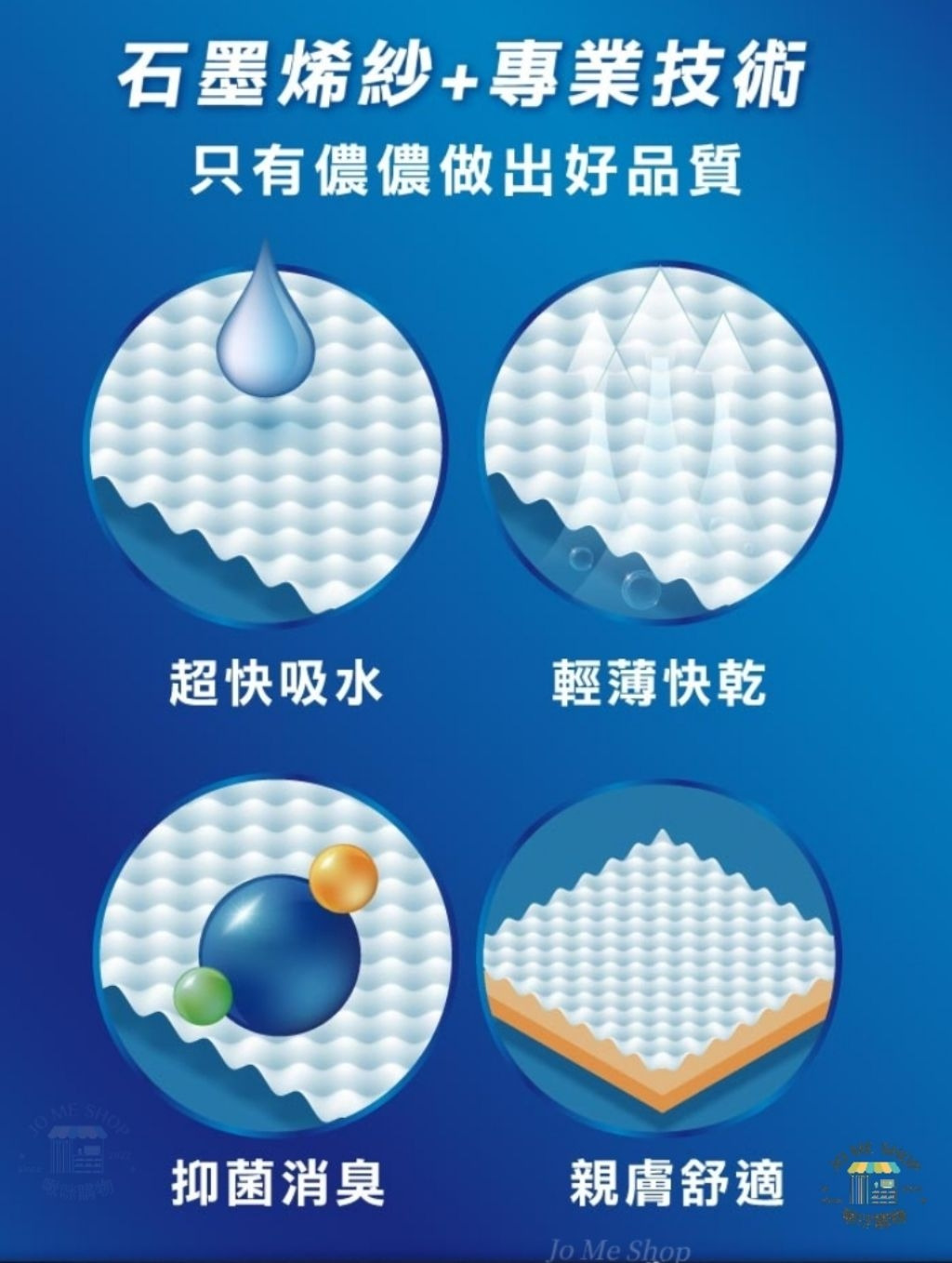 高密度石墨烯纖維 × 雙層結構,吸水力強、乾得快,不潮濕、不悶臭。