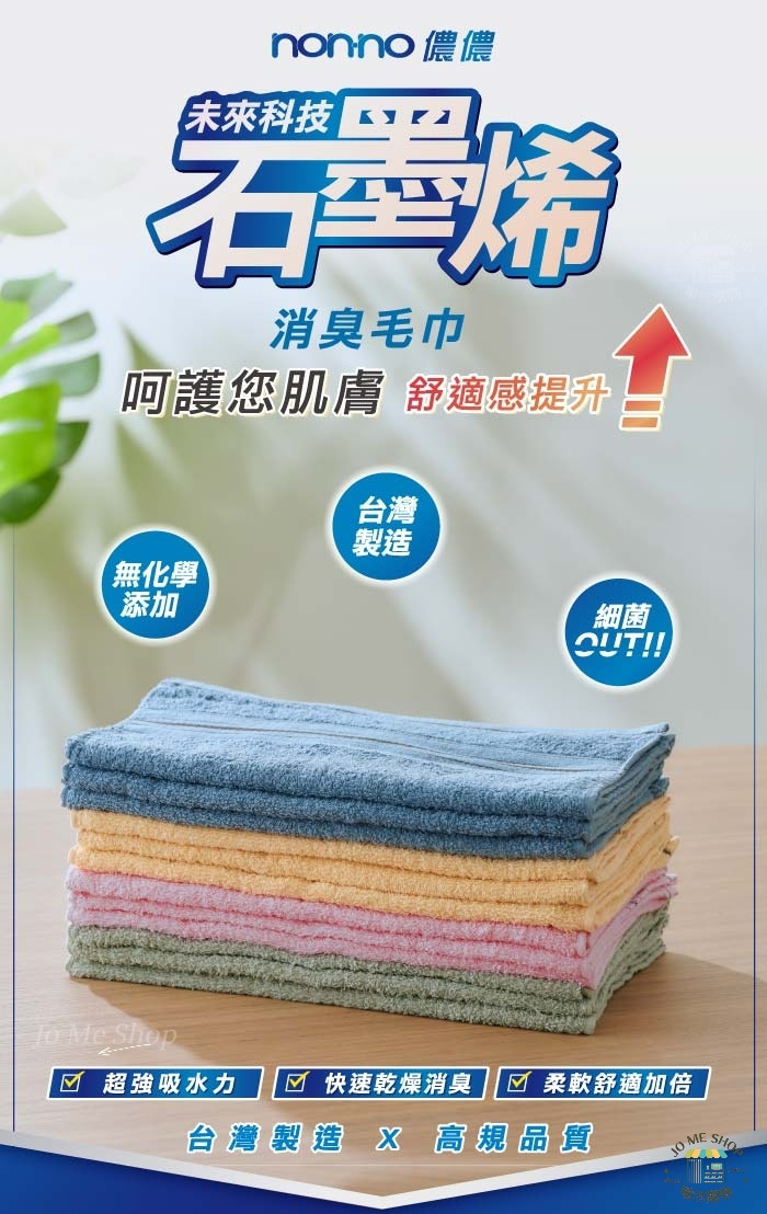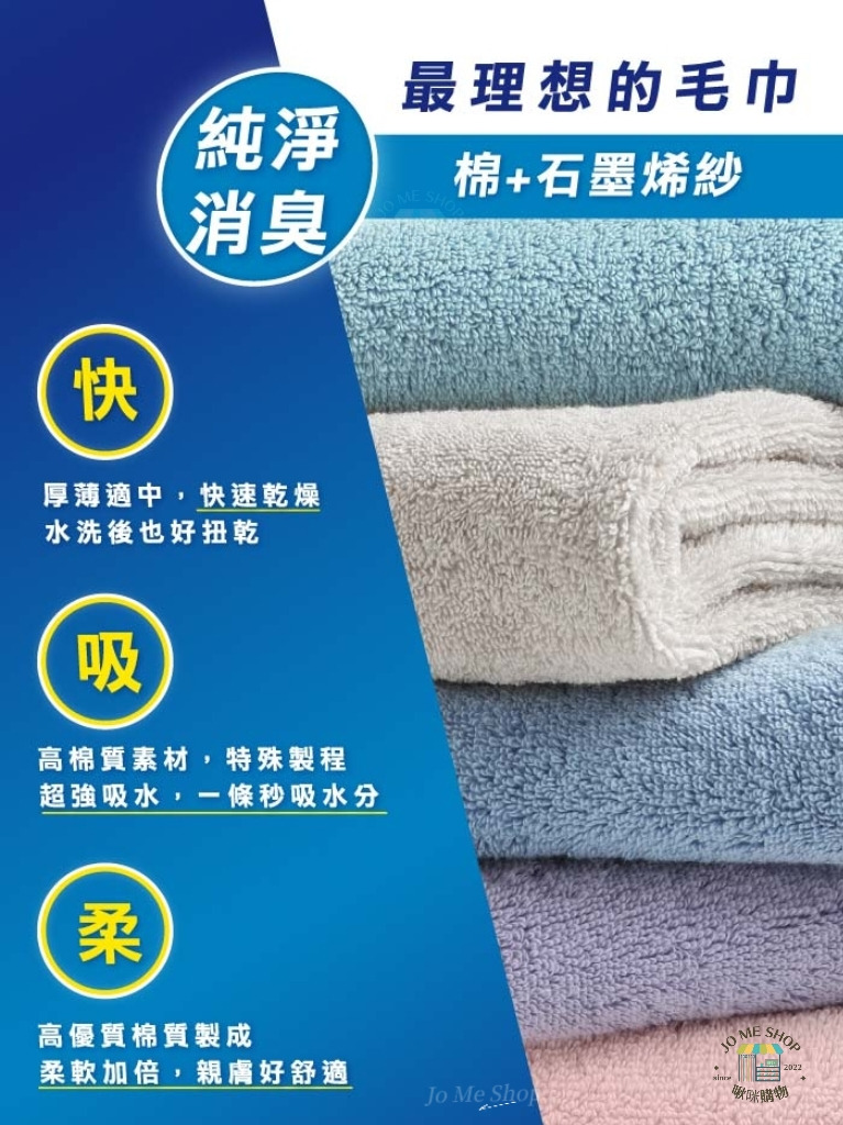 石墨烯可抑制細菌生成,毛巾不再越擦越臭,保持清爽與衛生。
