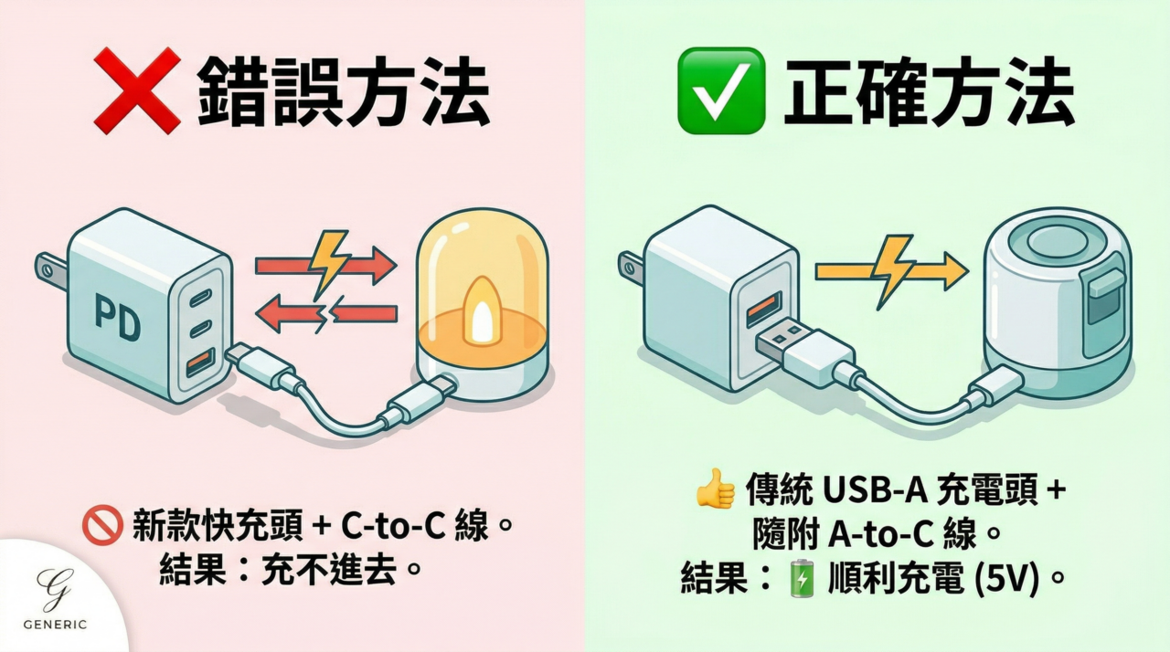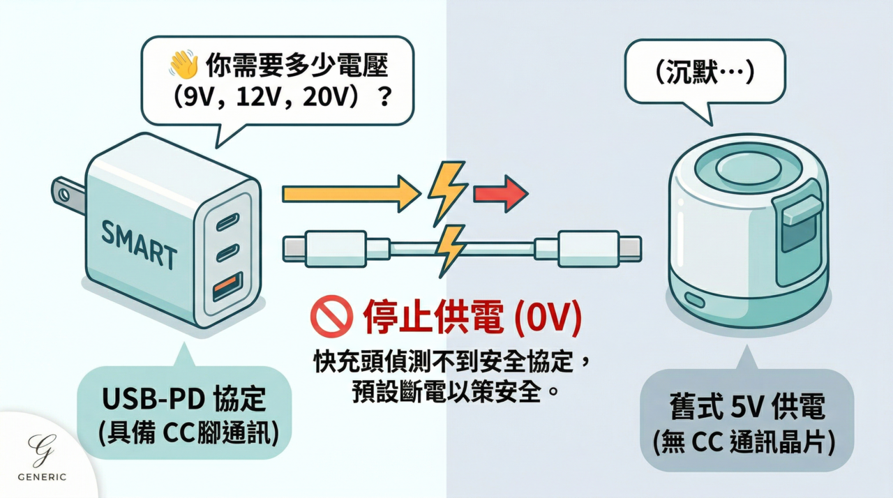 它們在供電前會先「對話」,確認對方需要多少電壓。因為我們的小家電(如夜燈、風扇)電路設計較為單純,聽不懂快充頭複雜的訊號,聰明的快充頭為了保護機器安全,會自動啟動保護機制,直接停止供電。