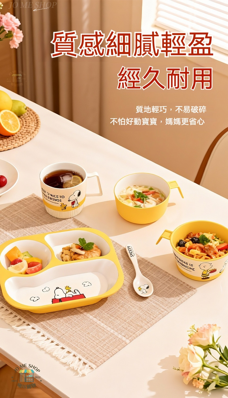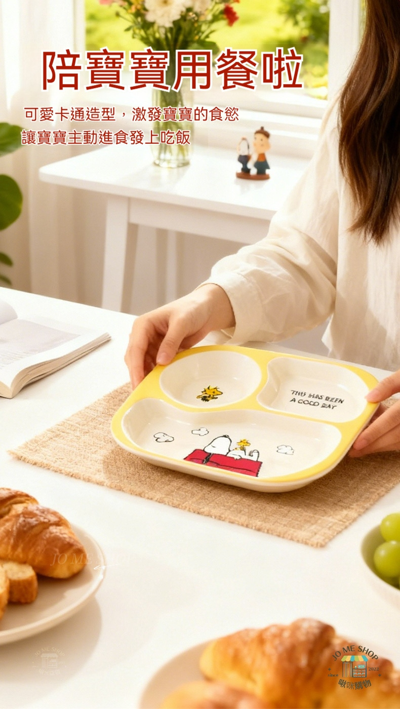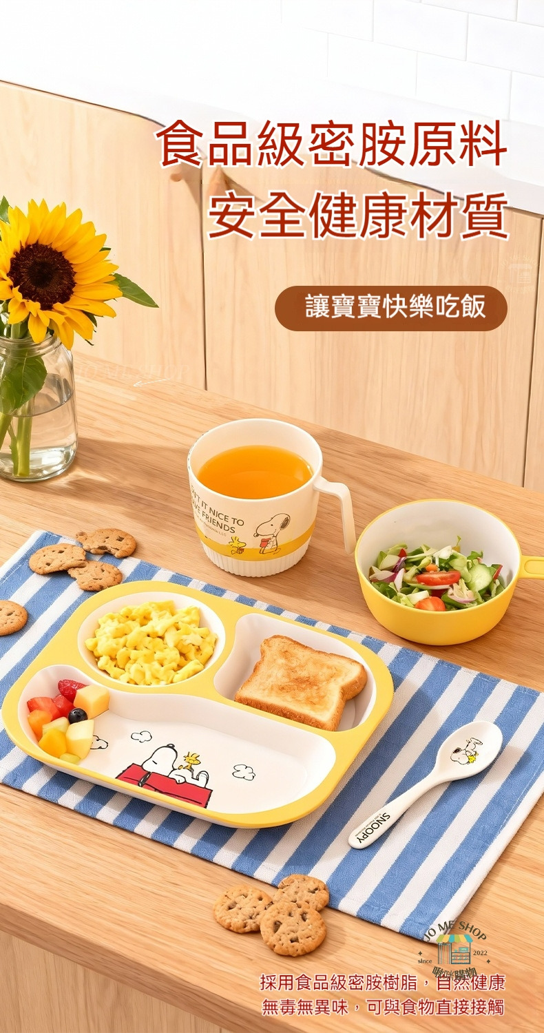 史努比黃白配色+壓花質感,可愛又耐看;分格餐盤不混味、加深容量更好盛,搭配好握手把碗/兒童杯/湯匙,從輔食到上學吃飯都超實用,送禮也很可以!