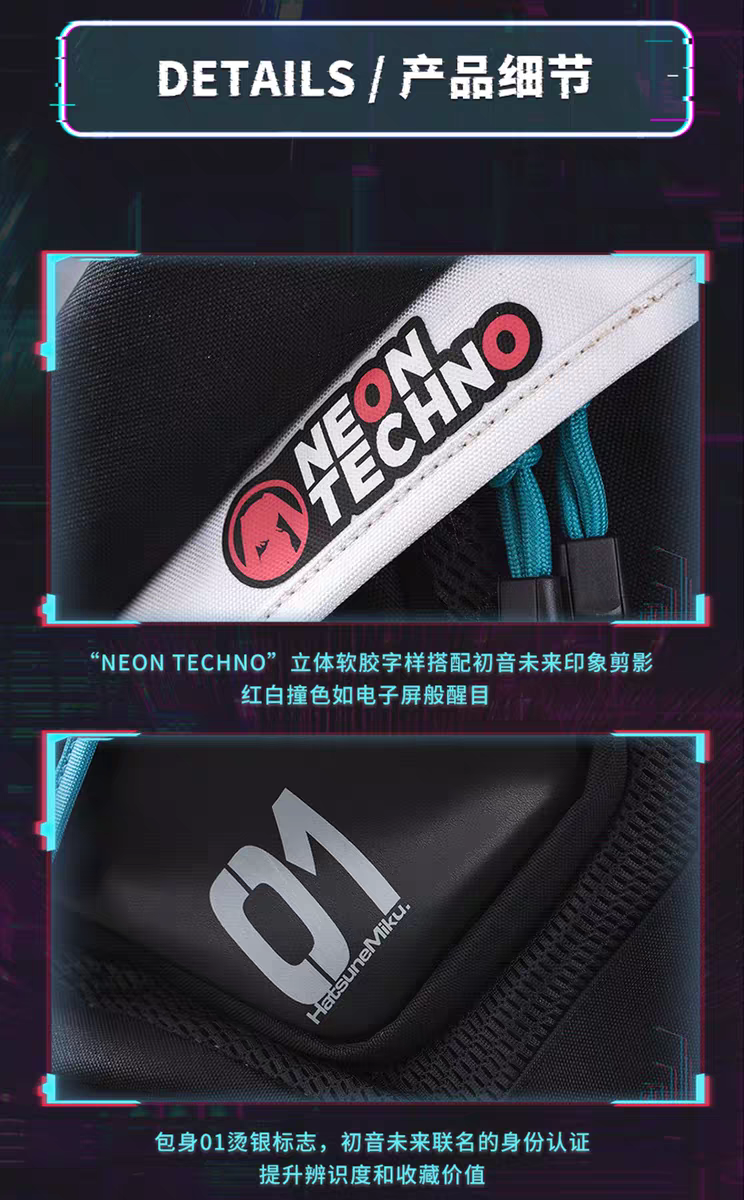 這不僅是一款背包,更是一件潮流單品。設計靈感源自 初音未來 (Hatsune Miku) 的電音世界,將未來感與實用性完美結合。