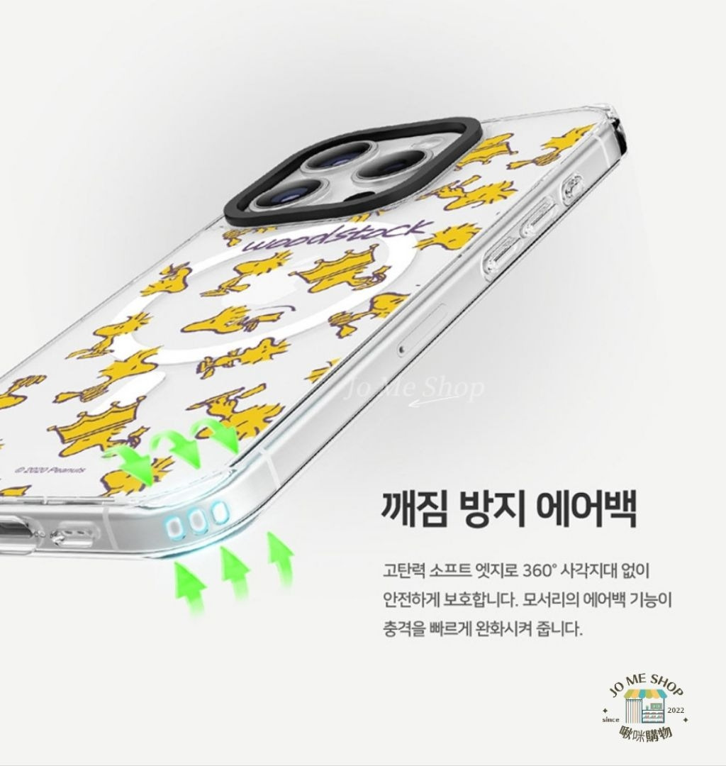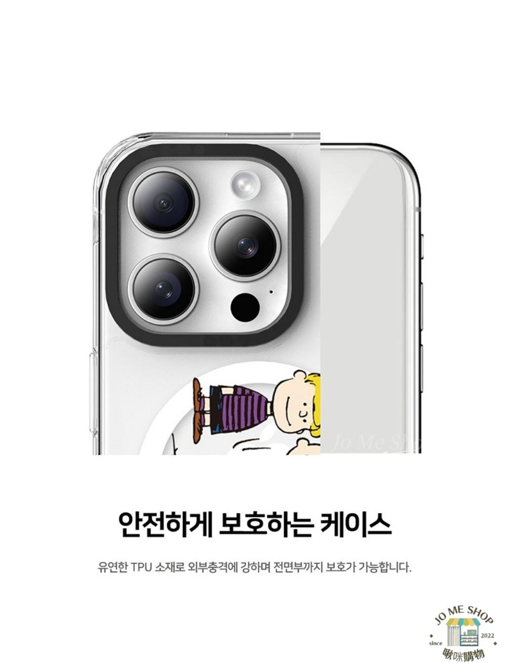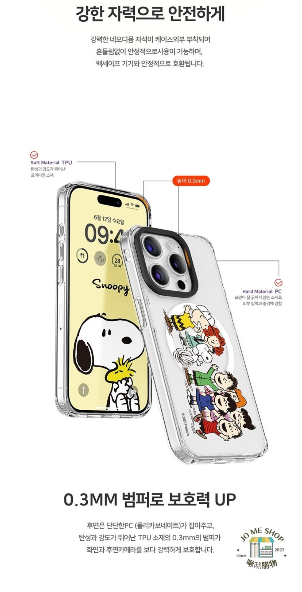 整體採用 高透光 TPU + PC 硬殼,清晰呈現 Snoopy、Woodstock、Charlie Brown 等經典角色。