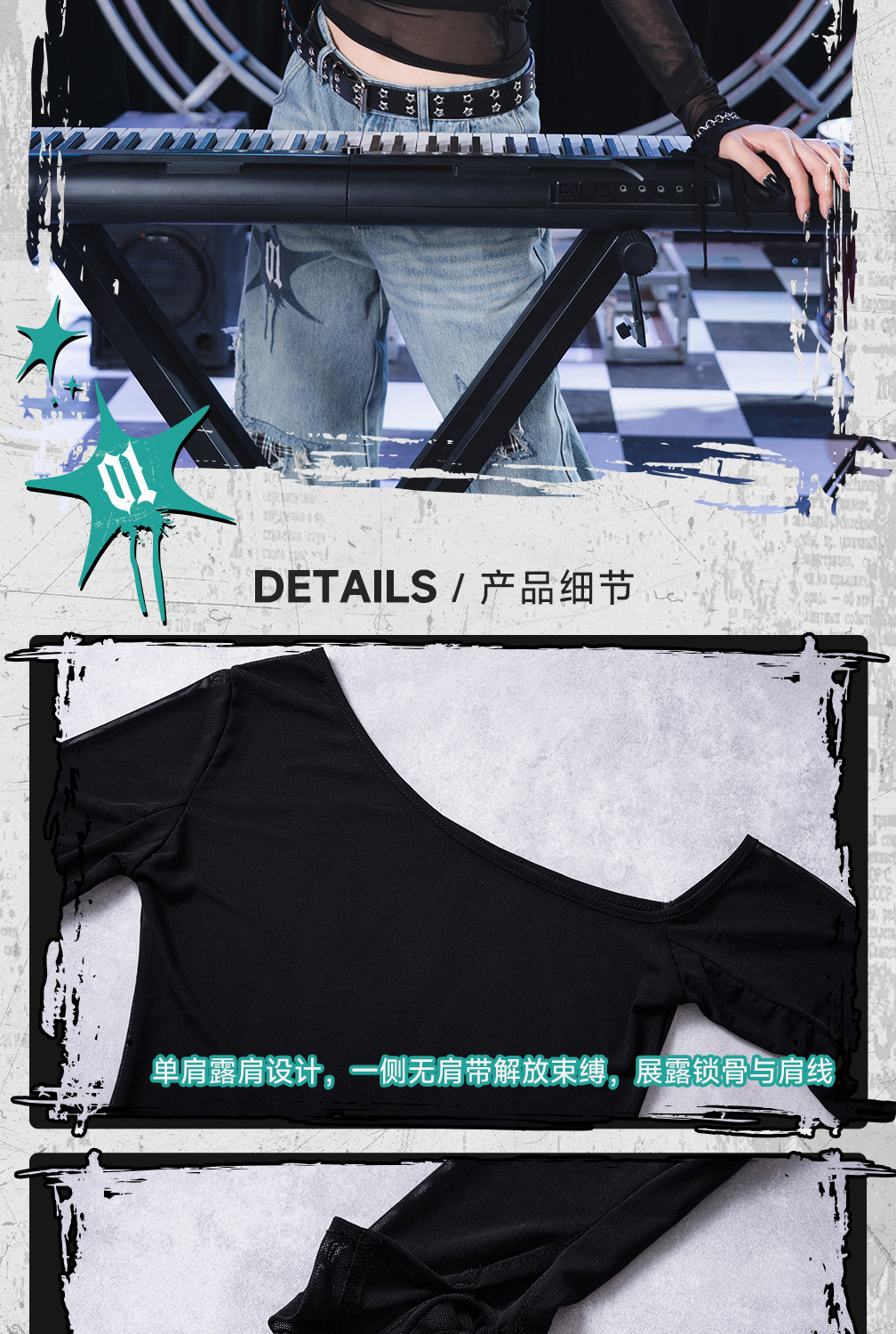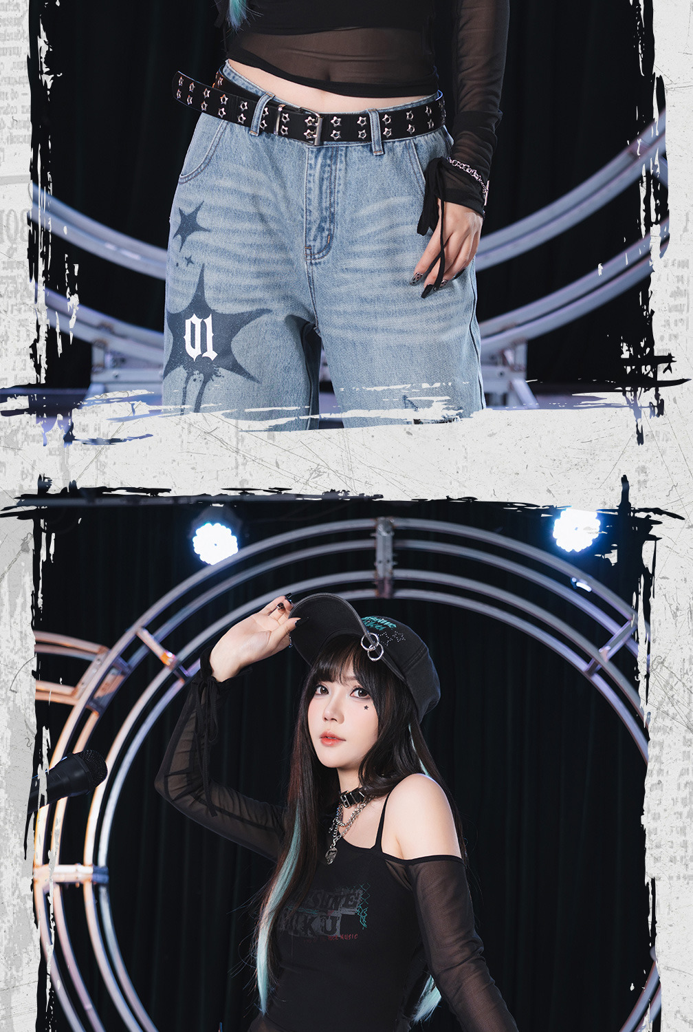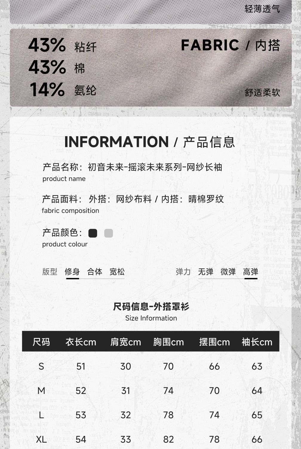 採用輕薄微透的網紗材質,增加視覺通透感。適合春秋單穿,或作為內搭展現獨特的「廢土工業風」。