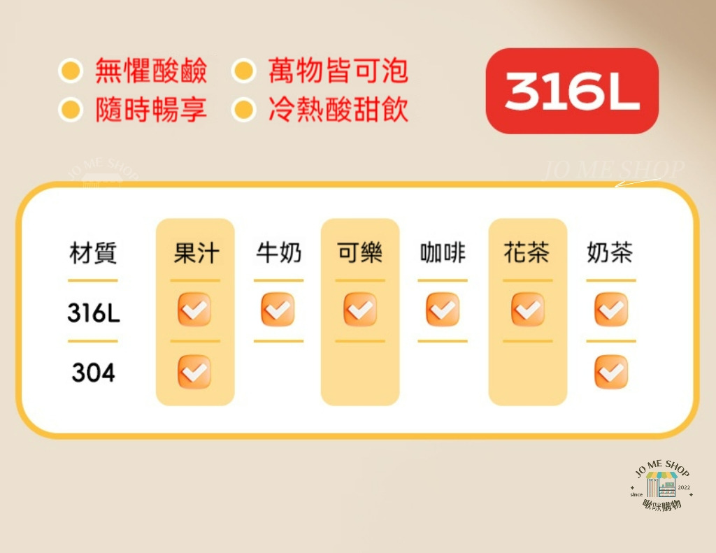 內膽升級 316 材質,比一般 304 更耐腐蝕、更抗酸鹼,裝咖啡、茶飲或果汁都安心。